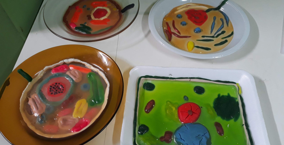 Após o estudo das células, os alunos do 1 ano 04 realizaram o desenvolvimento da mesma com massinha de modelar para representar a membrana, as organelas, e o núcleo. Utilizando também gelatina representando o suco celular que preenche o citoplasma e o núcleo.